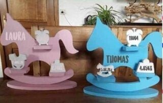 Er zijn steeds 4 symbolen bij geplaatst voor de geboorte gegevens zoals:lengte,uur,gewicht en datum. (deze staan op plankje)