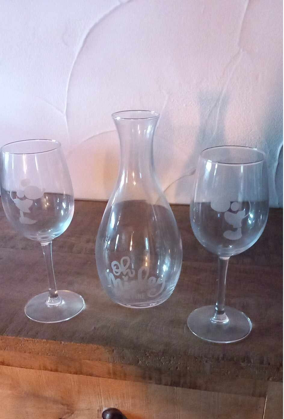 2 wijnglazen ( Mickey en Minnie) samen met een klein karafje voor extra wijn.