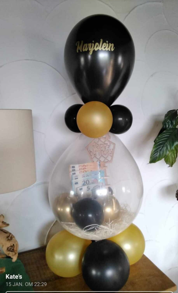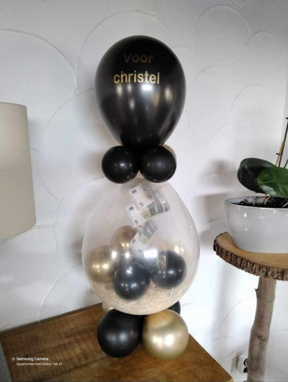 Vanaf 50€ cash geld word het geld aan een houten geldclip bevestigd , anders aan een touwtje of los in de ballon.