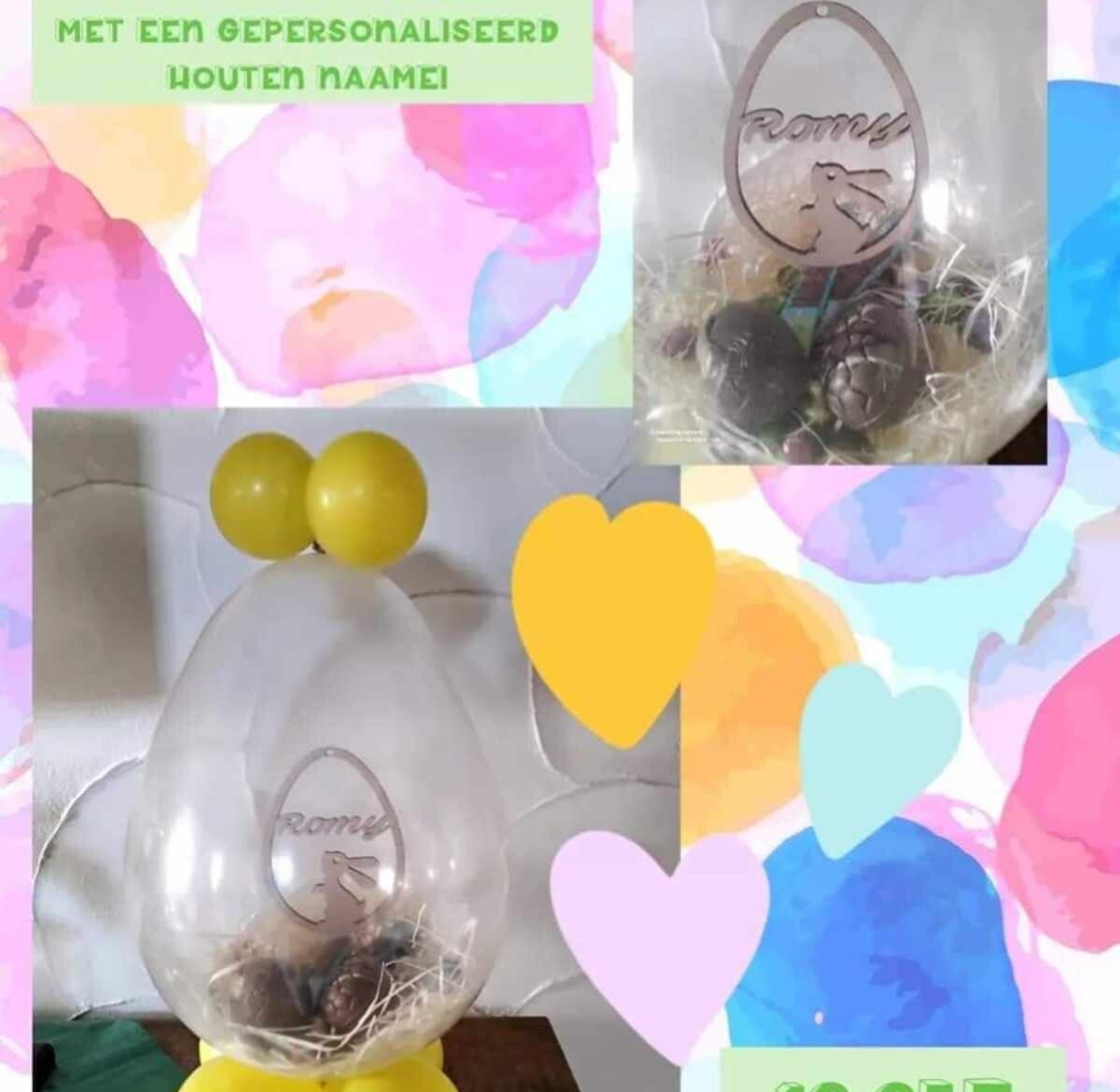 Paasballon gevuld met lekkers en een groot houten paashanger met naam .