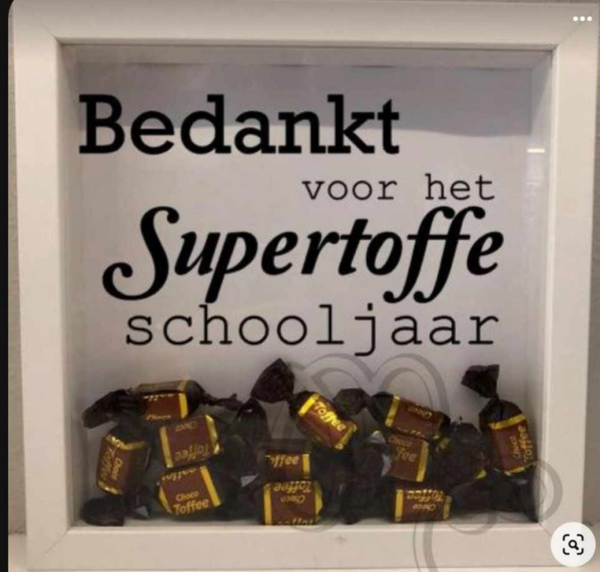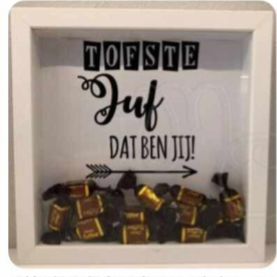 Wit kader gevuld met chocotoff en voorzien van een aangepaste tekst.