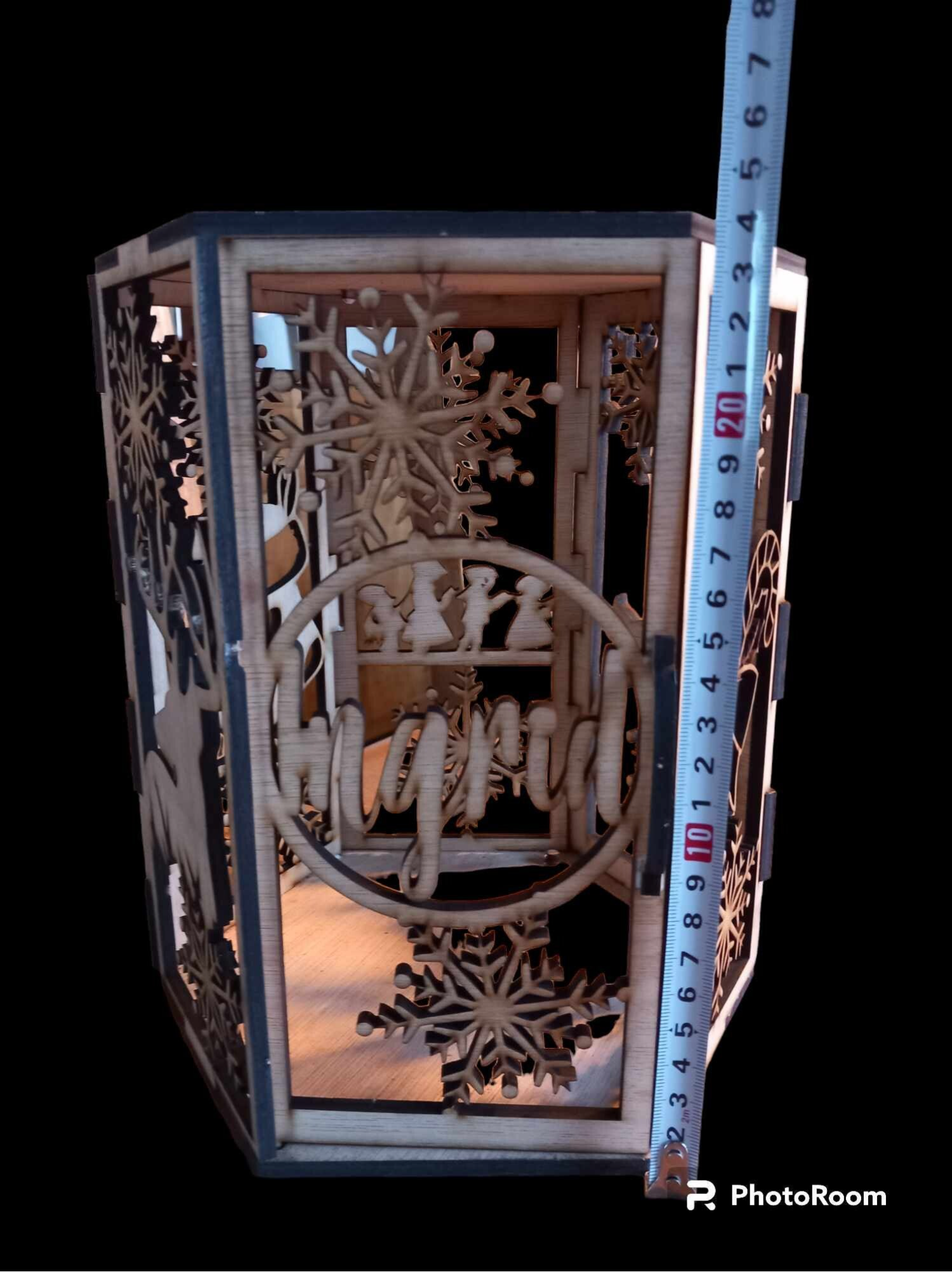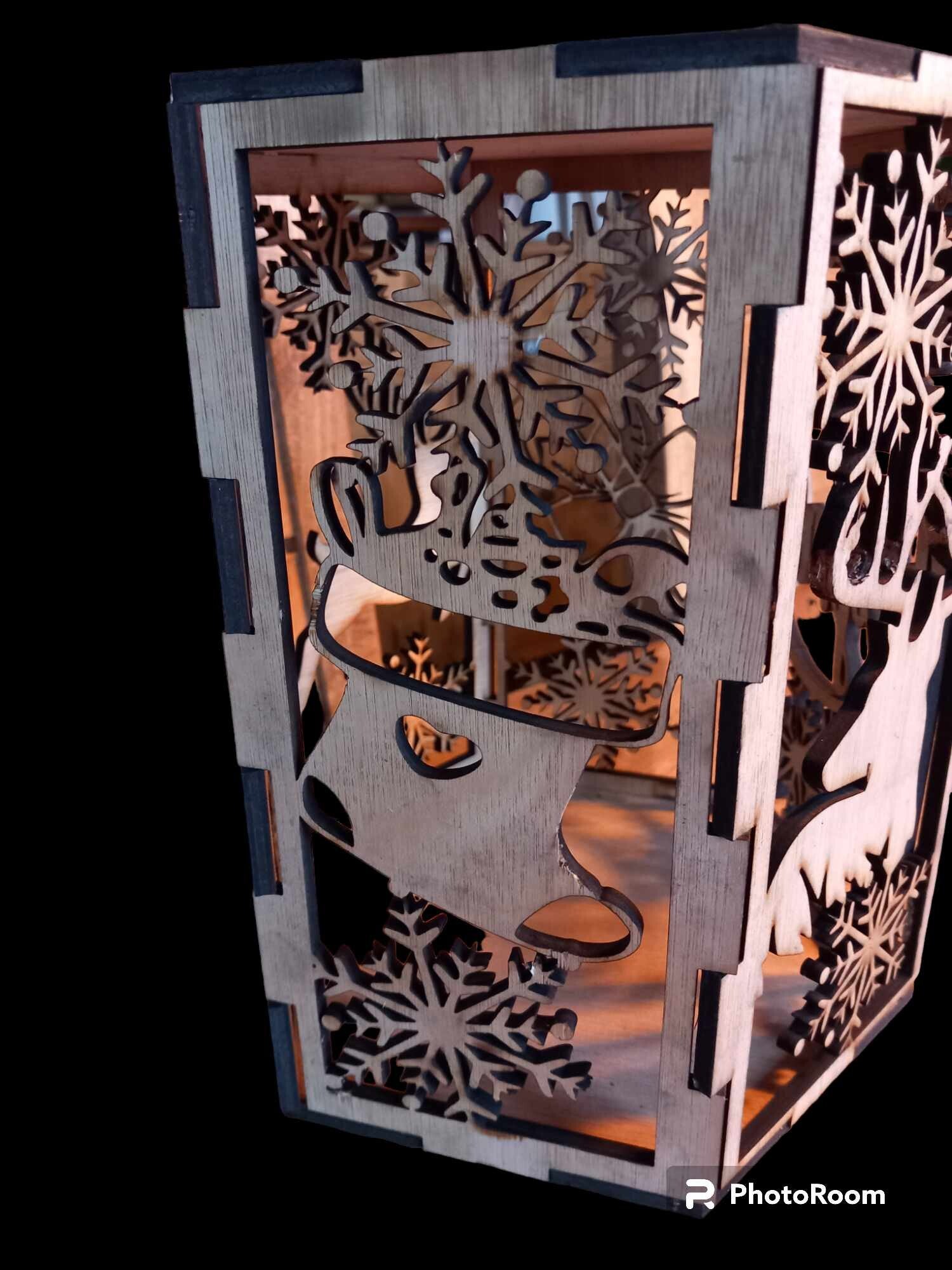 Mooie houten kerstlantaarn. Op elke zijde een mooie illustratie , op het deurtje word een naam of kleine tekst voorzien. Is ideaal voor een mooie stompkaars of groot theelicht ( het beste op batterijen, daar het een volledige houten lantaarn is )