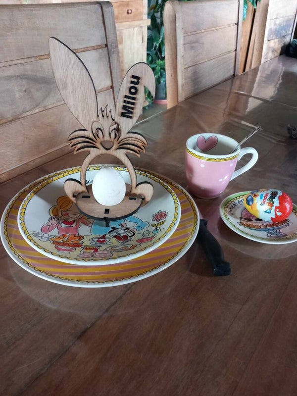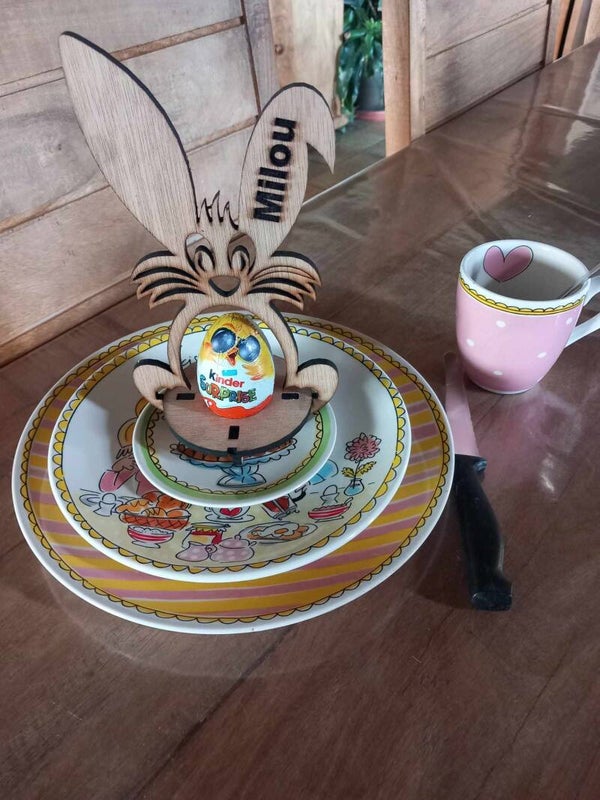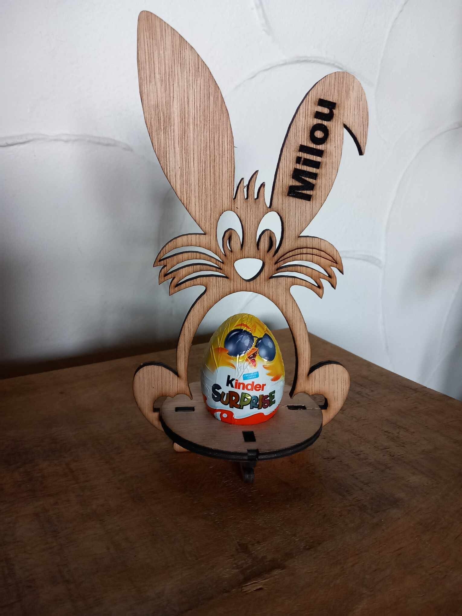 Houten paashaas voorzien van een Kinderei. De naam komt in het oor .