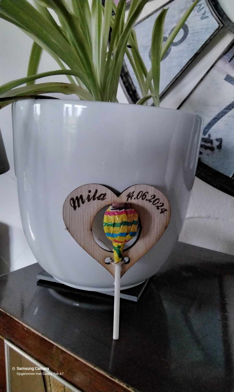 Lekstokhouder in hartjesvorm . Ideaal om als geschenkje te geven bij de verjaardag van u kind. De naam en geboortedatum word erop gebrand....