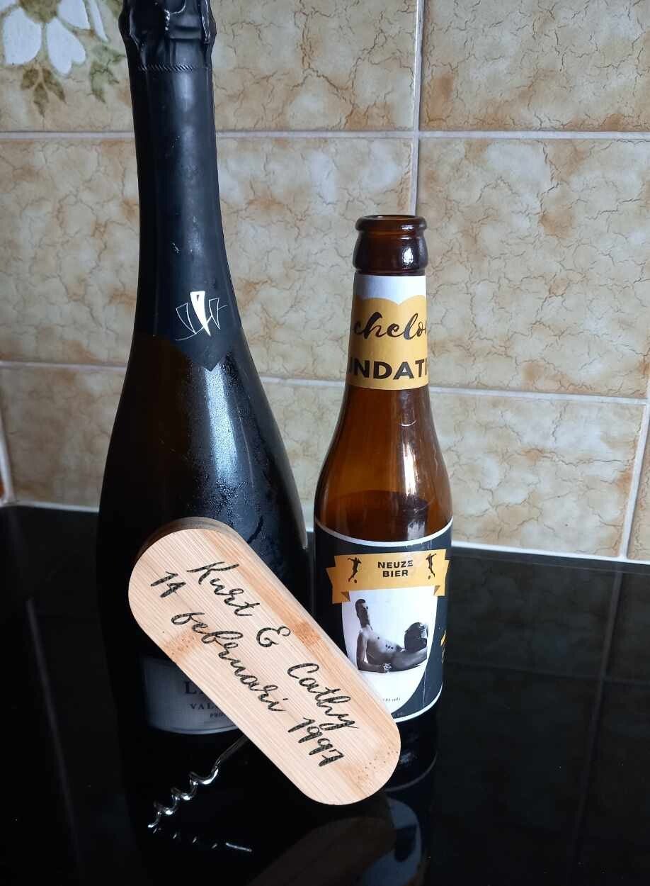 Supermooi en nuttig geschenk om aan elke koppel te geven op uw huwelijksfeest. De flesopener is magnetisch ,, dus is nadien een eyecatcher op de koelkast....