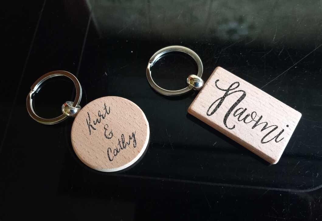 kleine sleutelhangers in Beuk om aan ieder koppel te geven als bedanking op uw huwelijk. word gelaserd met de namen van de bruid en bruidegom.