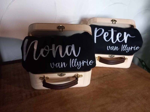 Kan voorzien worden van tekst naar keuze . Ideaal als koffertje voor de geldenveloppen of om te vullen als herinnering voor Meter, Peter, grootouders....