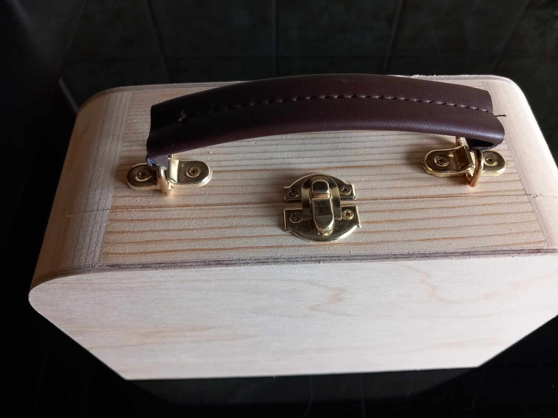 Houten koffertje in Grenen , voorzien van lederen handvat.