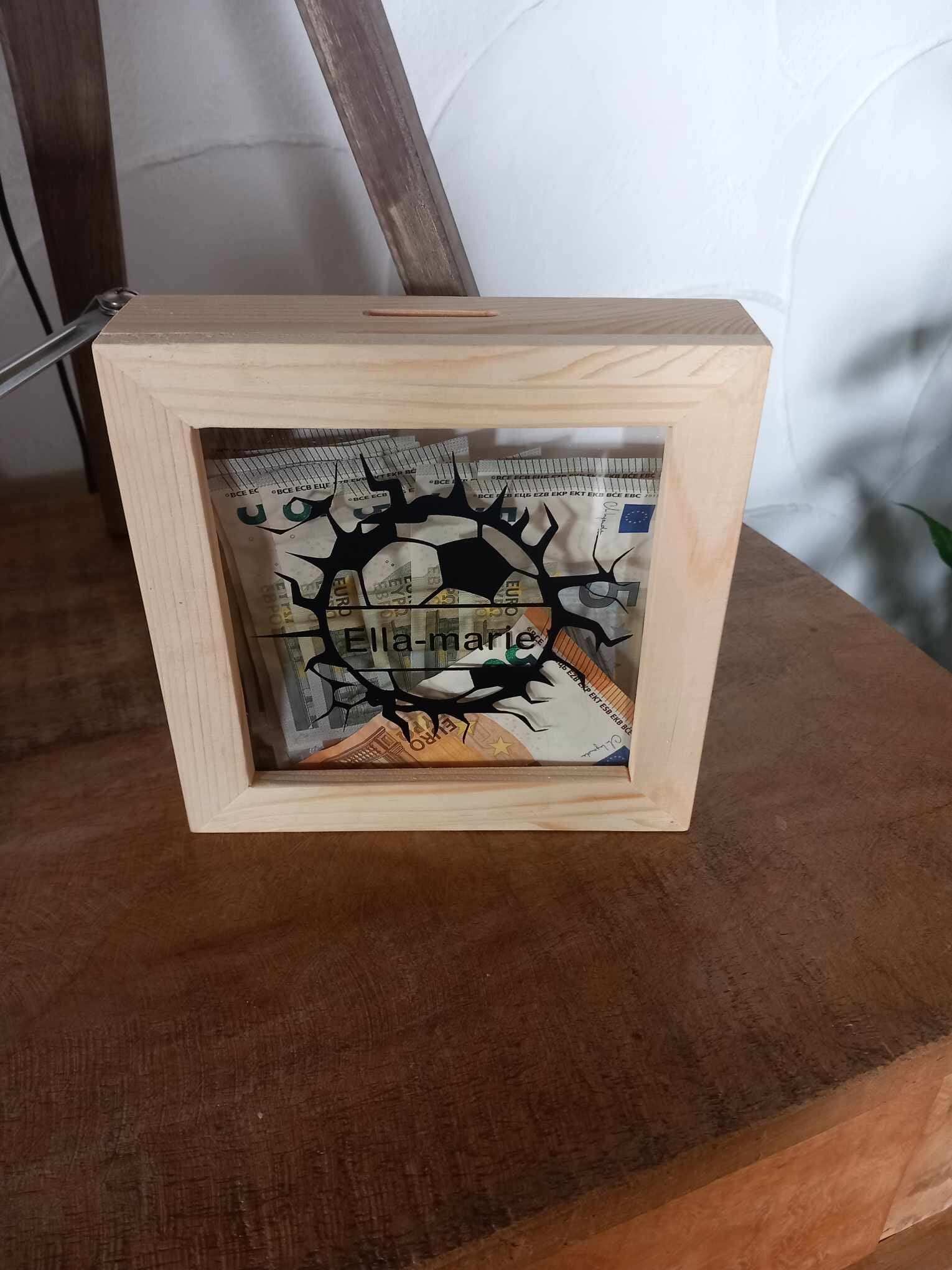 Houten spaarpot kader met plexivoorzijde die kan gepersonaliseerd worden naar keuze . Kan voor verjaardag , trouw, pensioen, geboorte....