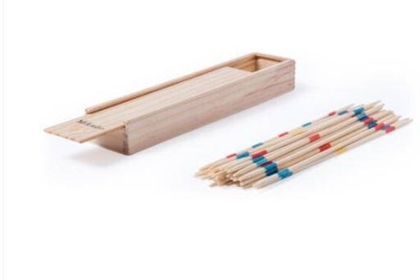 Mikadospel in houten schuifdoosje . Op deksel van het doosje kan er een naam en datum gezet worden.