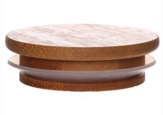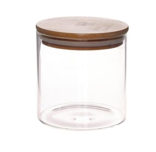 Hoge glazen cilinder bewaarpot met bamboedeksel.