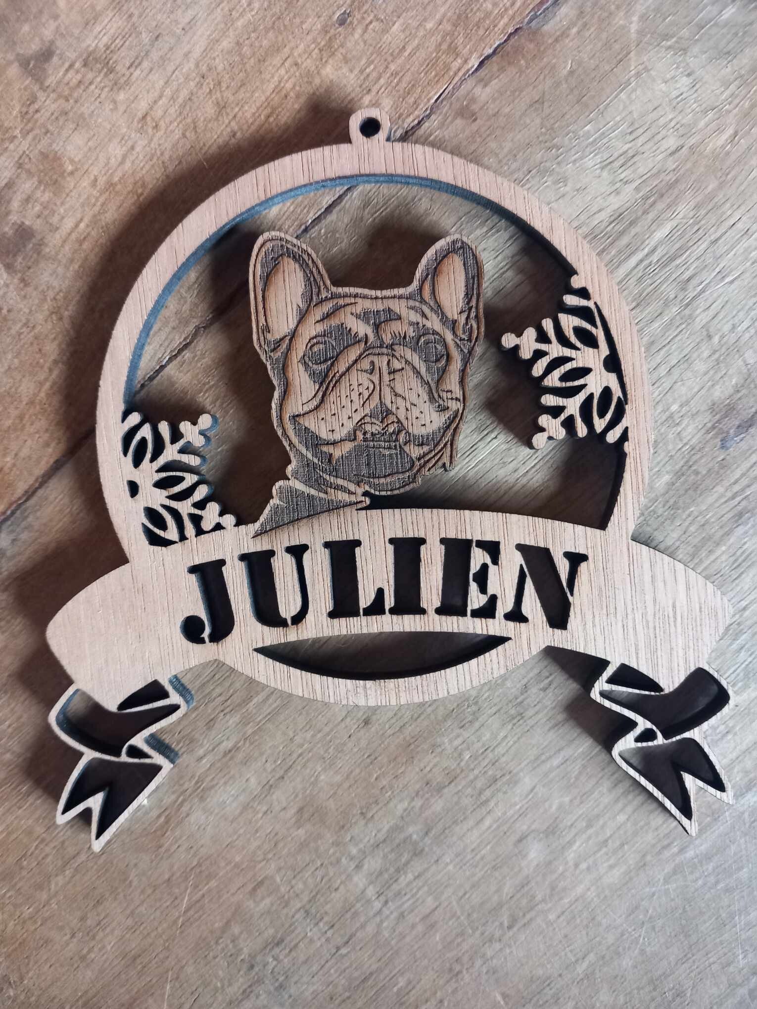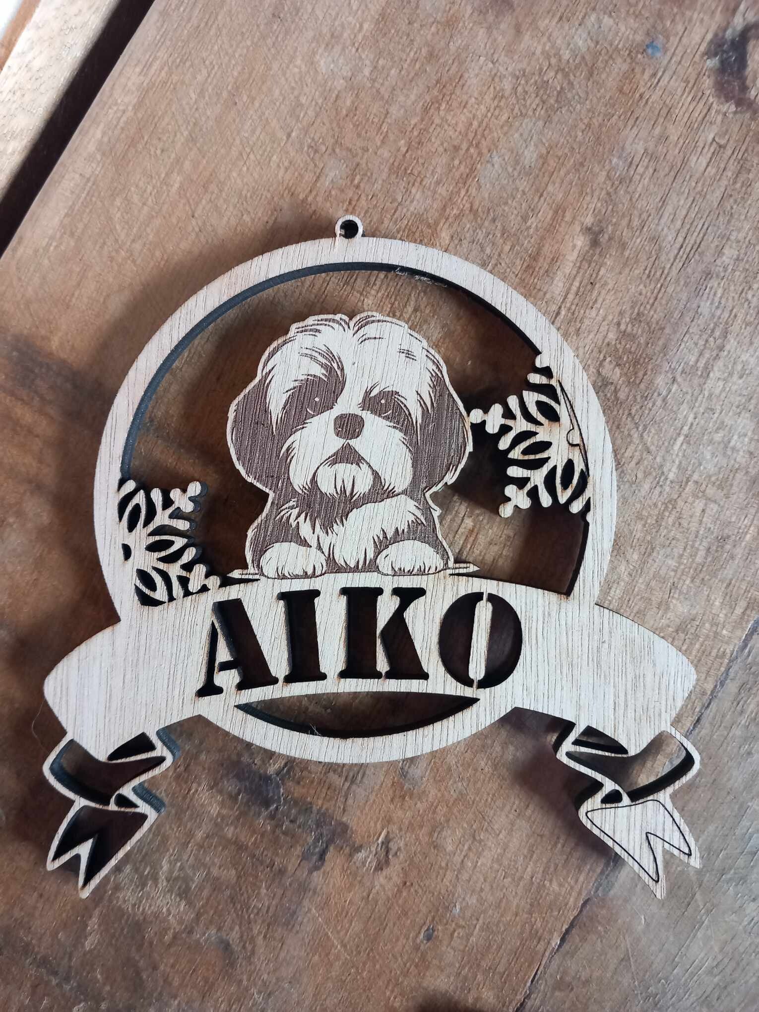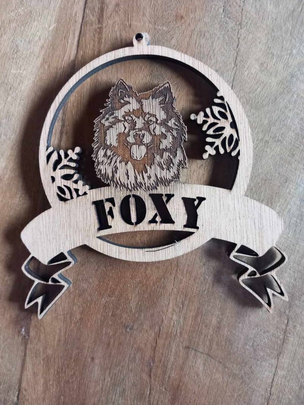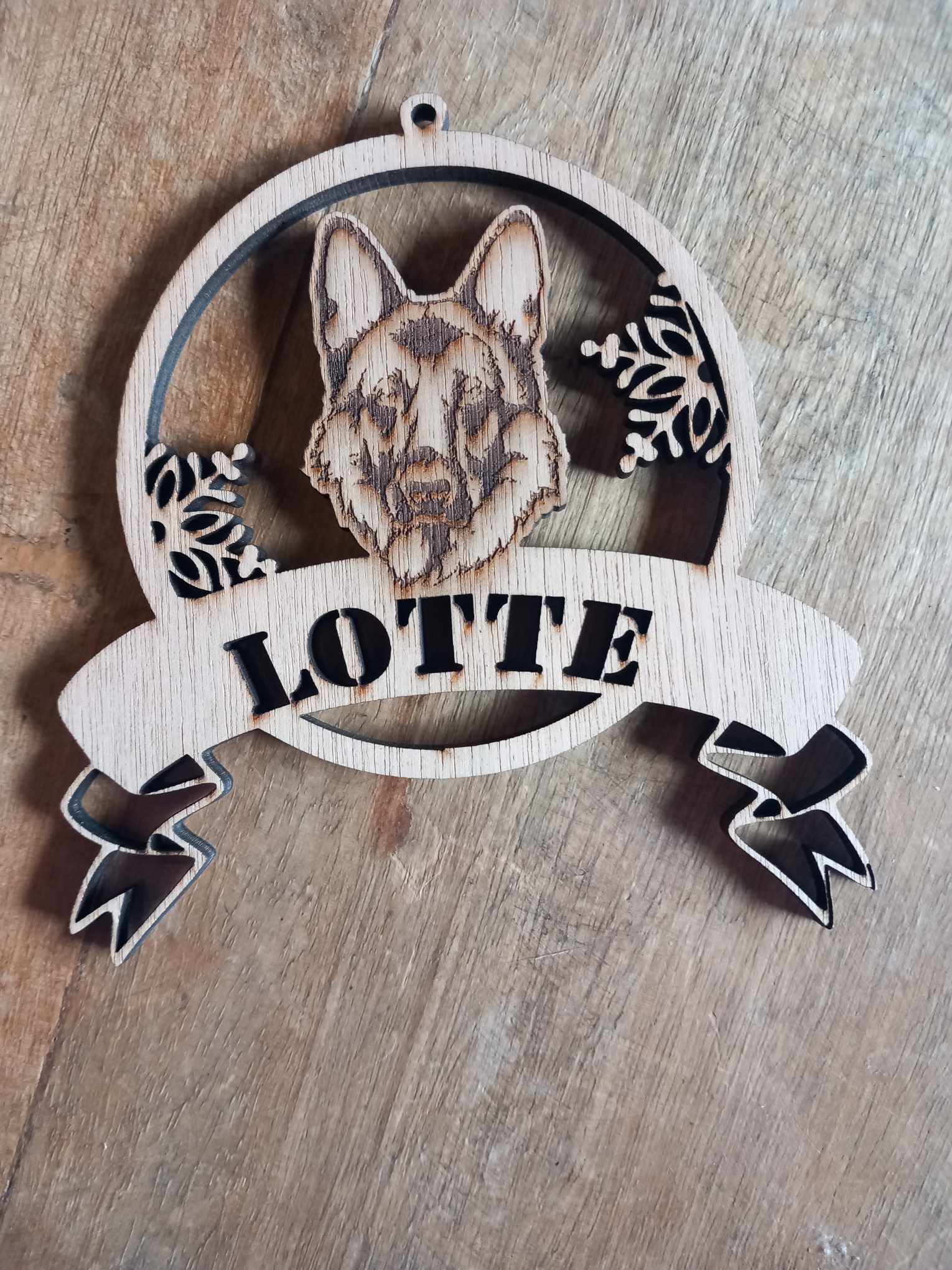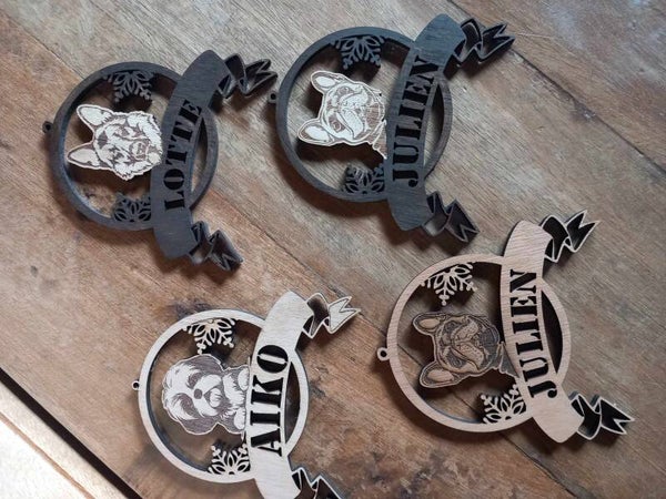 Houten kersthanger met naam en illustratie van uw huisdier (qua ras). We maken een kersthanger met een gelaserde afdruk van het ras van u hond en plaatsen de naam in de banner.