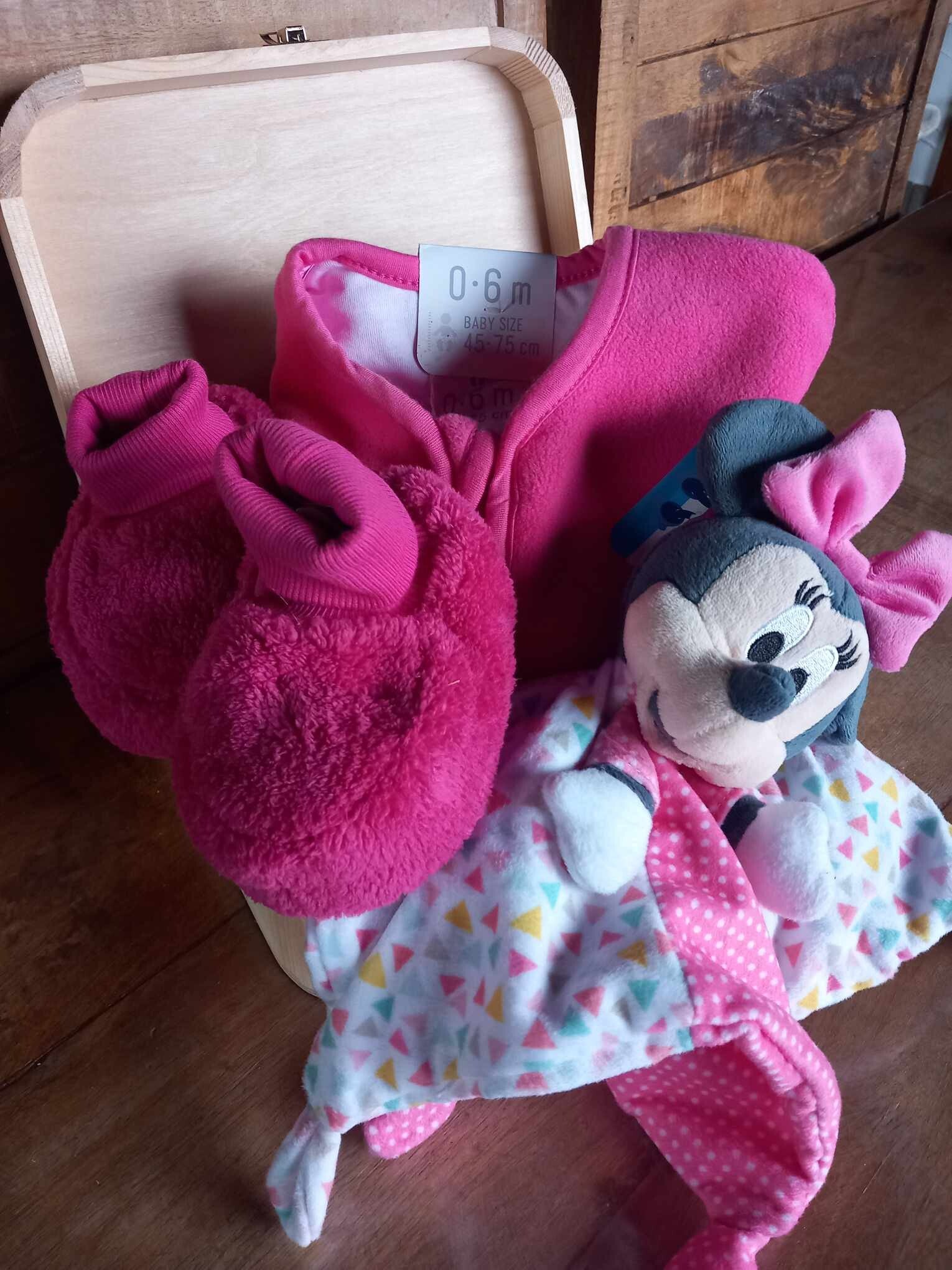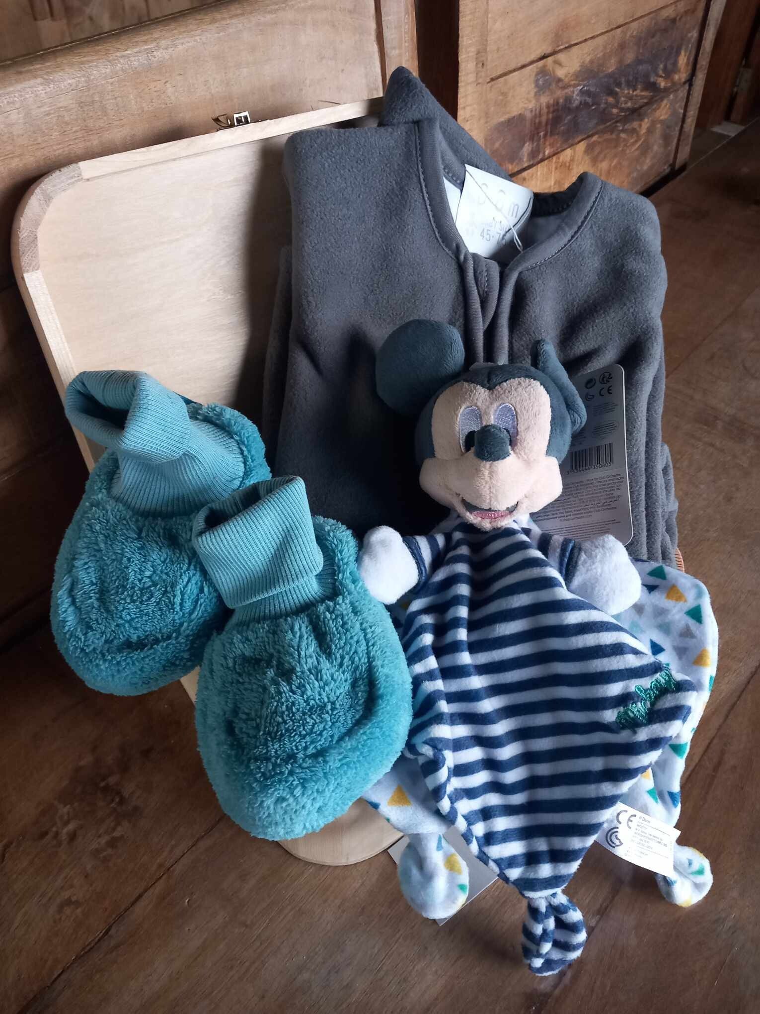 Houten koffertje voorzien van naam en geboortedatum(gegraveerd) en gevuld met een slaapzak met mouwen , pantoffeltjes en een doudou waar naam word op geborduurd.