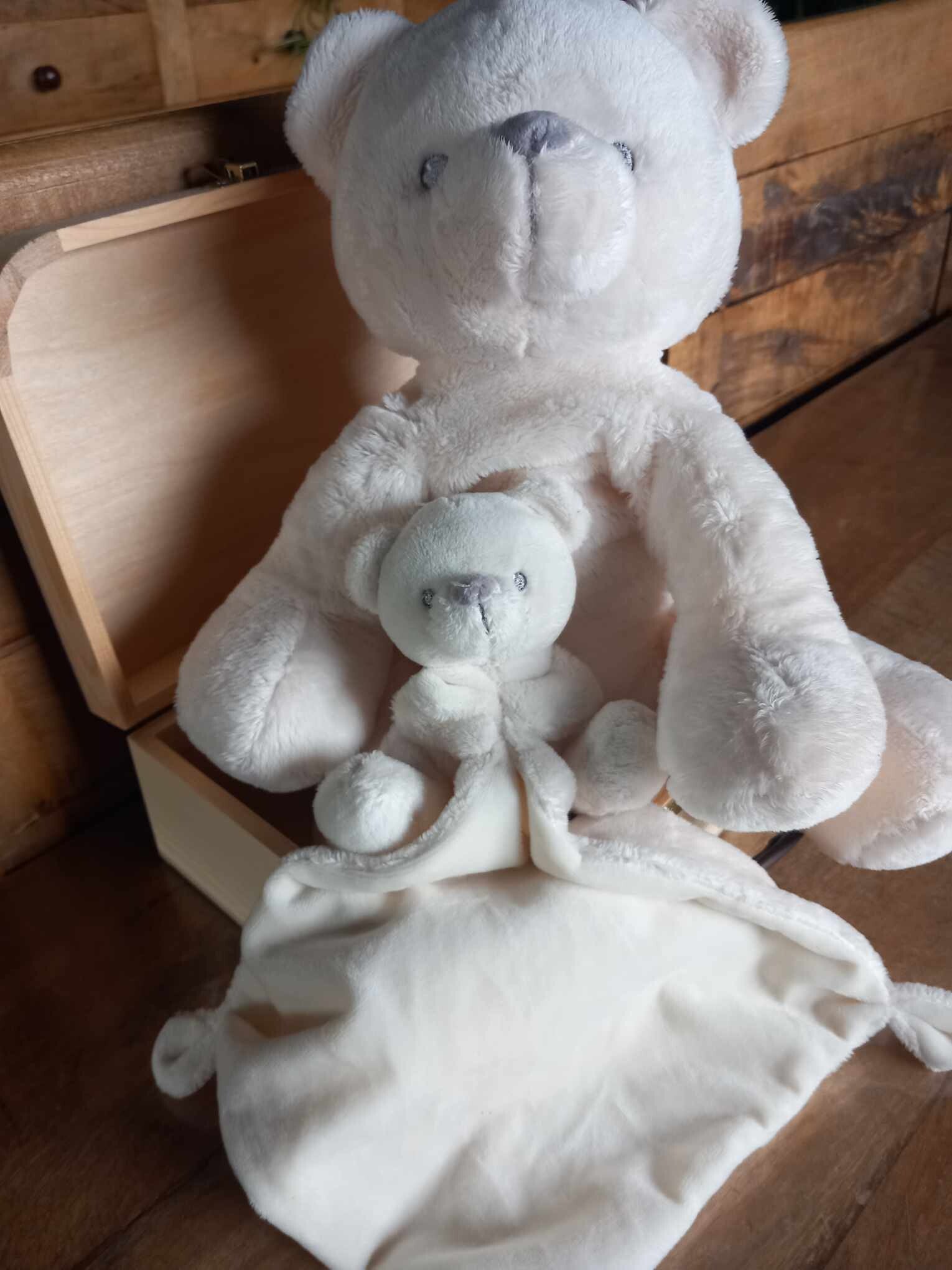 Houten koffertje voorzien van een grote knuffelbeer van 30cm en bijhorende doudou . Op de doudou word de naam geborduurd.