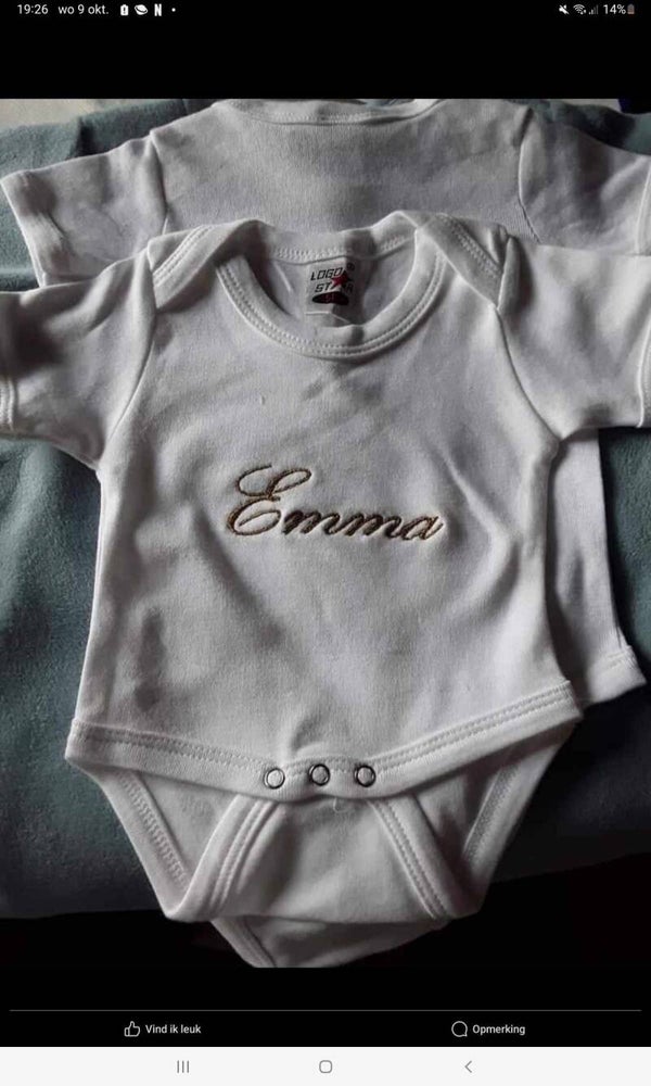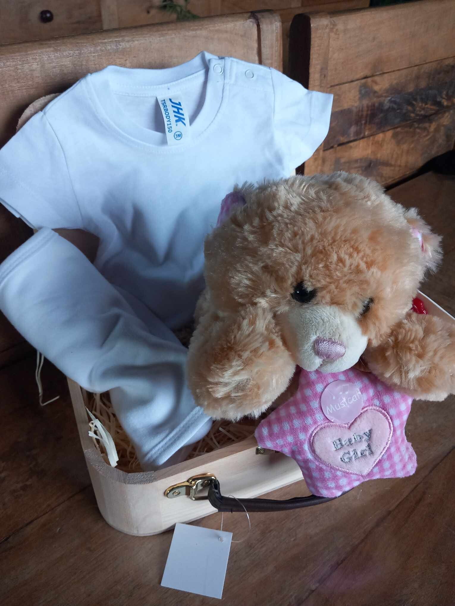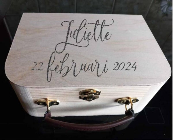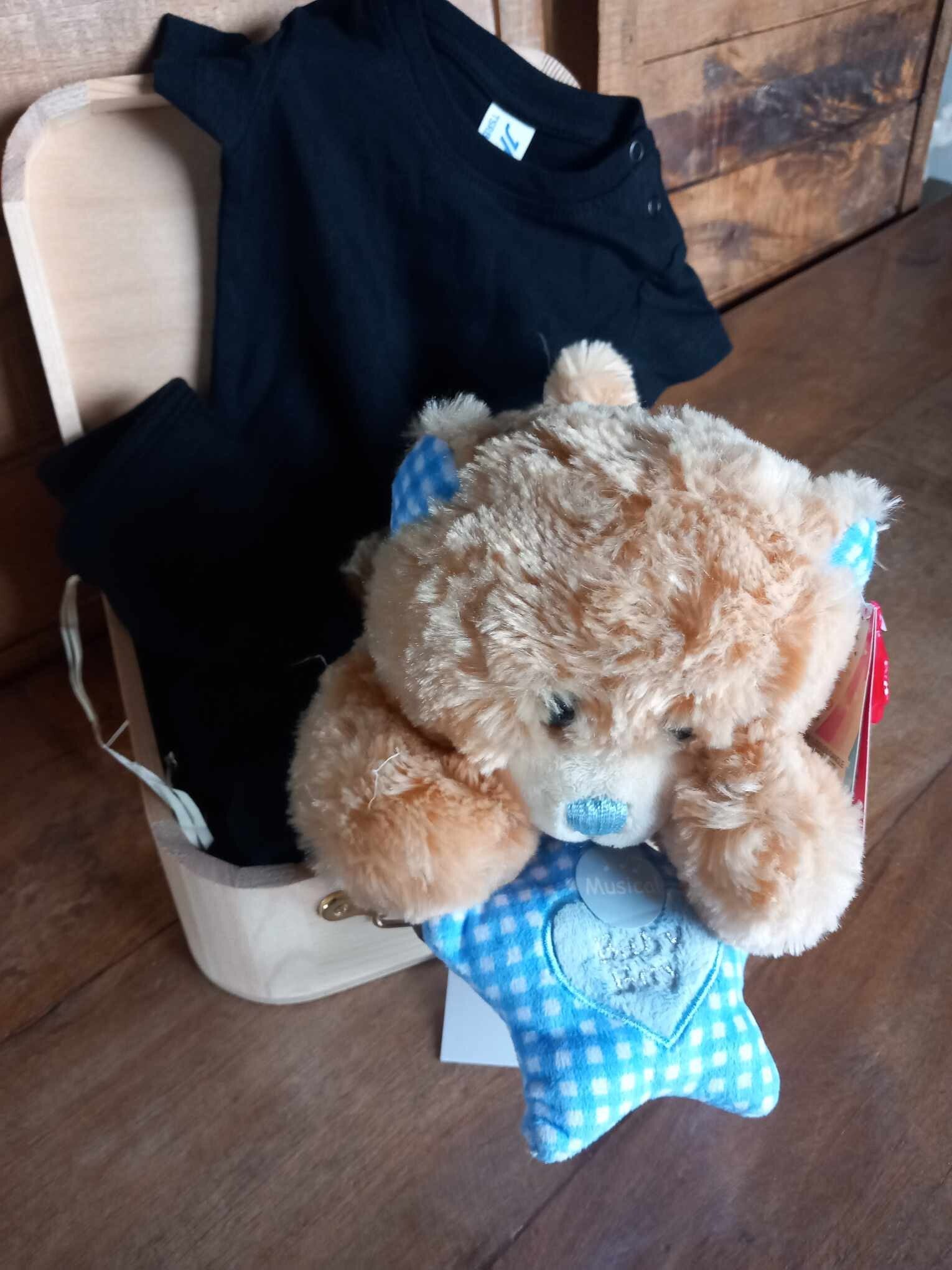 Houten koffertje voorzien van naam en geboortedatum (gelaserd) en gevuld met body en slabbetje voorzien van naam geborduurd. Tevens zit er een leuk beertje bij met trekkoord met slaapliedje.