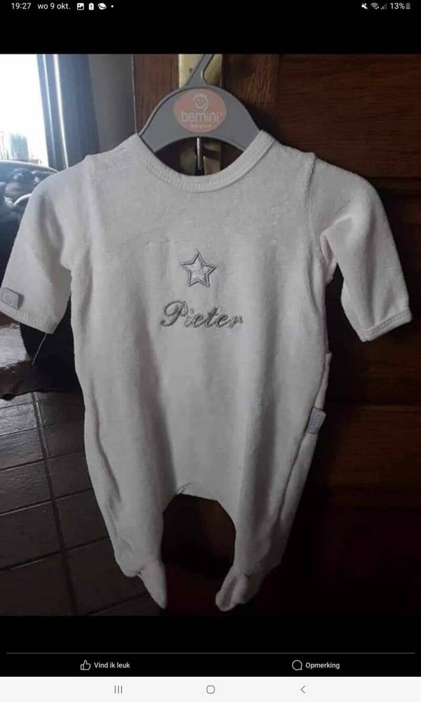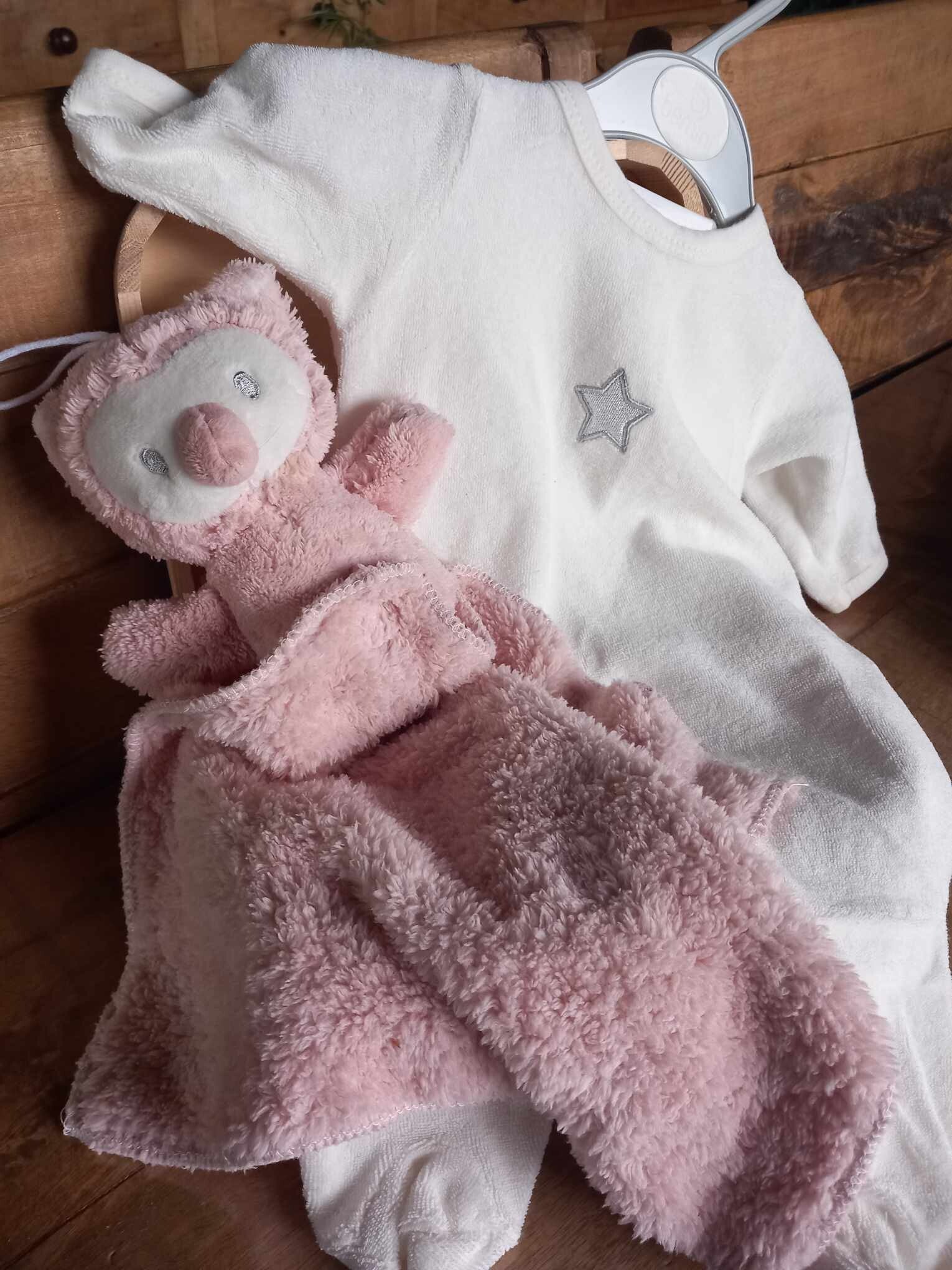 Houten koffertje met naam en geboortedatum (gelaserd) gevuld met een wit pyjama met voetjes maat 0 tot 3 maand en kleine knuffel (roze uiltje) met afneembare doudou (geborduurd met naam)
