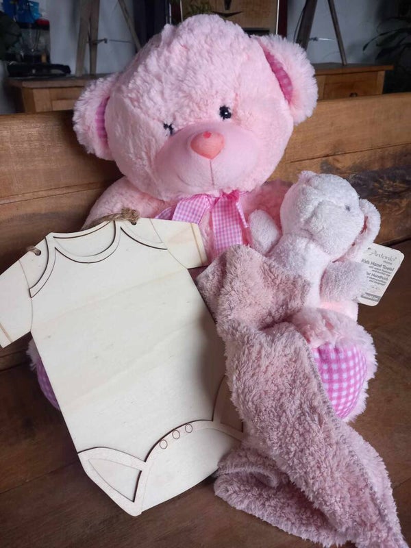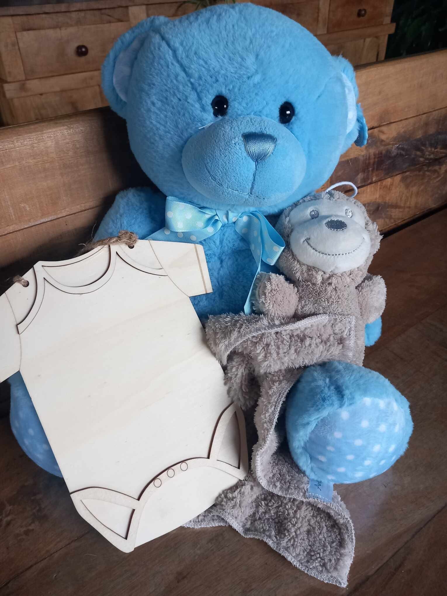 Grote superzachte grote ( 30cmgroot) knuffelbeer met een gepersonaliseerde houten rompertje (voorzien van naam en geboortedatum), ideaal voor aan de kamerdeur ,boven bedje ....en een kleine knuffel met afneembare doudou (voorzien van naam geborduurd)