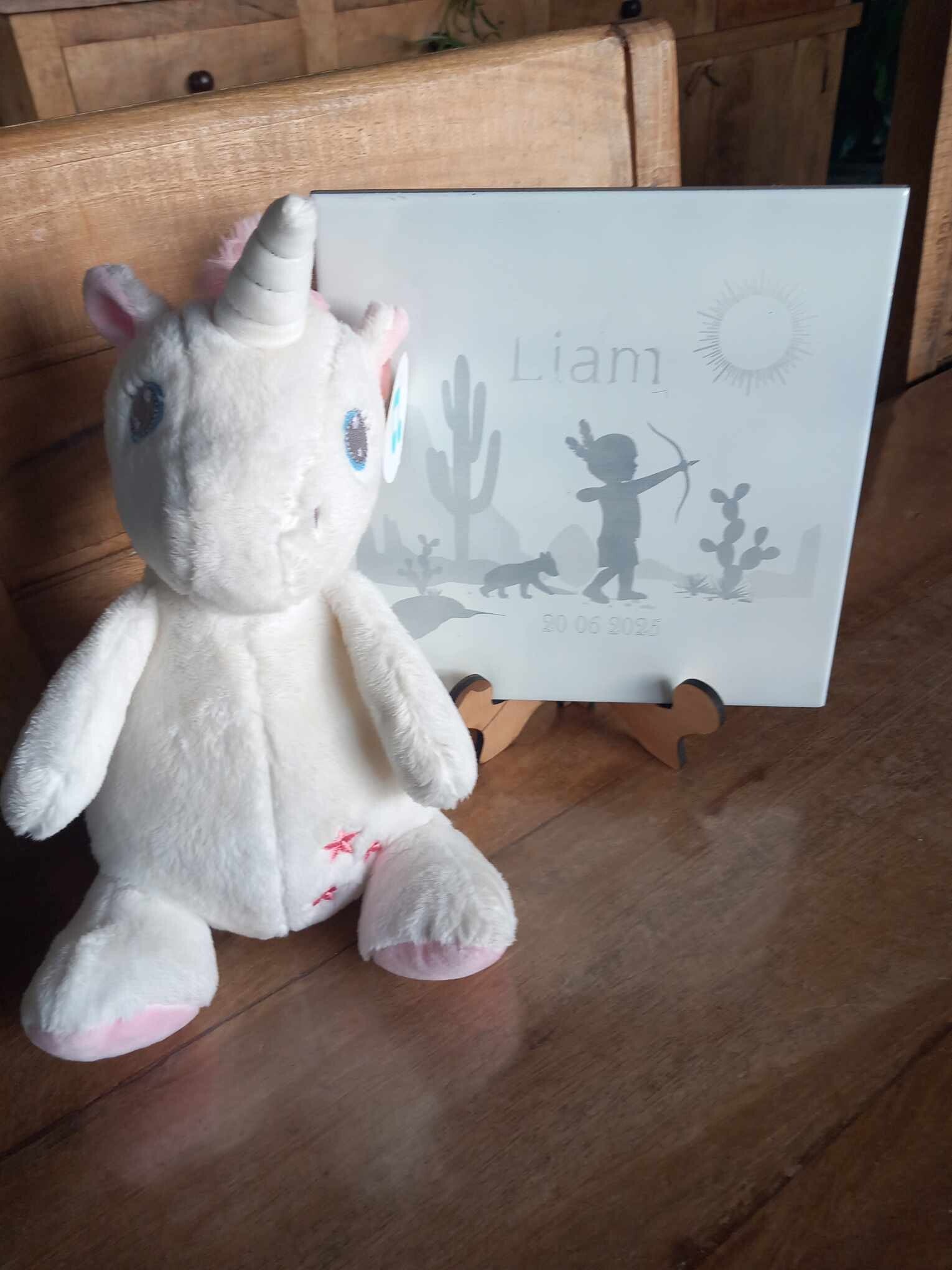 Keramische tegel op voet, voorzien van alle geboorte gegevens en geïnspireerd op het geboortekaartje samen met een zachte knuffel van 25 cm waar de staart kan uitgetrokken worden om het slaapliedje te horen.