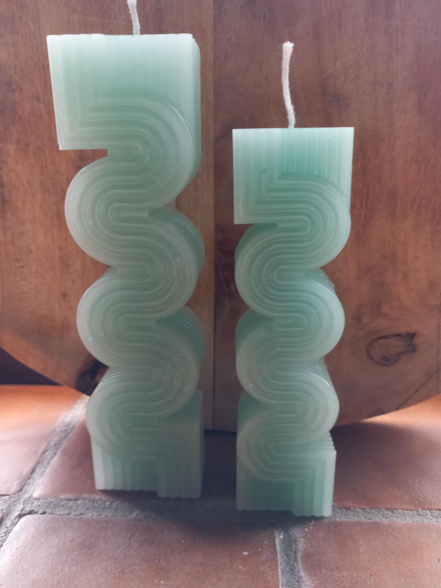 Mooie moderne kaarsen met swirlmotief , mintgroen...in 2 verschillende hoogtes.