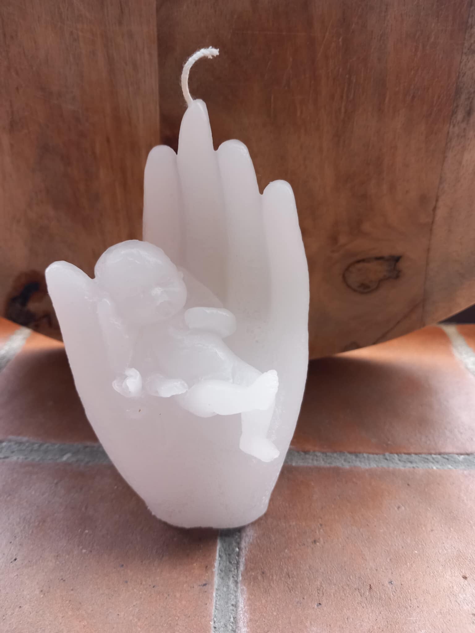 Supermooie kaars van een baby'tje in de hand. ORIGINEEL om als meter en peter te vragen of als klein geschenkje bij een babybezoek.