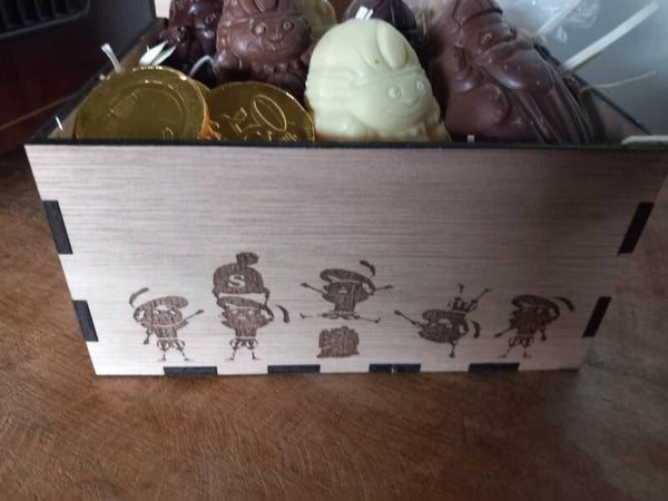 Mooi kistje met Sint en Pieten op de daken . Vooraan boven de dansende Pieten kan dan naam van het kind gelaserd worden.