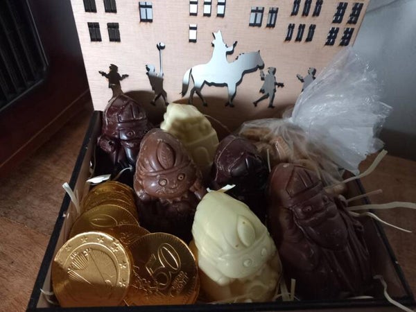Gevuld met maar liefst 0.5kg lekkers . ( 300gr chocolade : wit,melk,fondant + 100 gr chocoladecenten + 100gr picknicken)