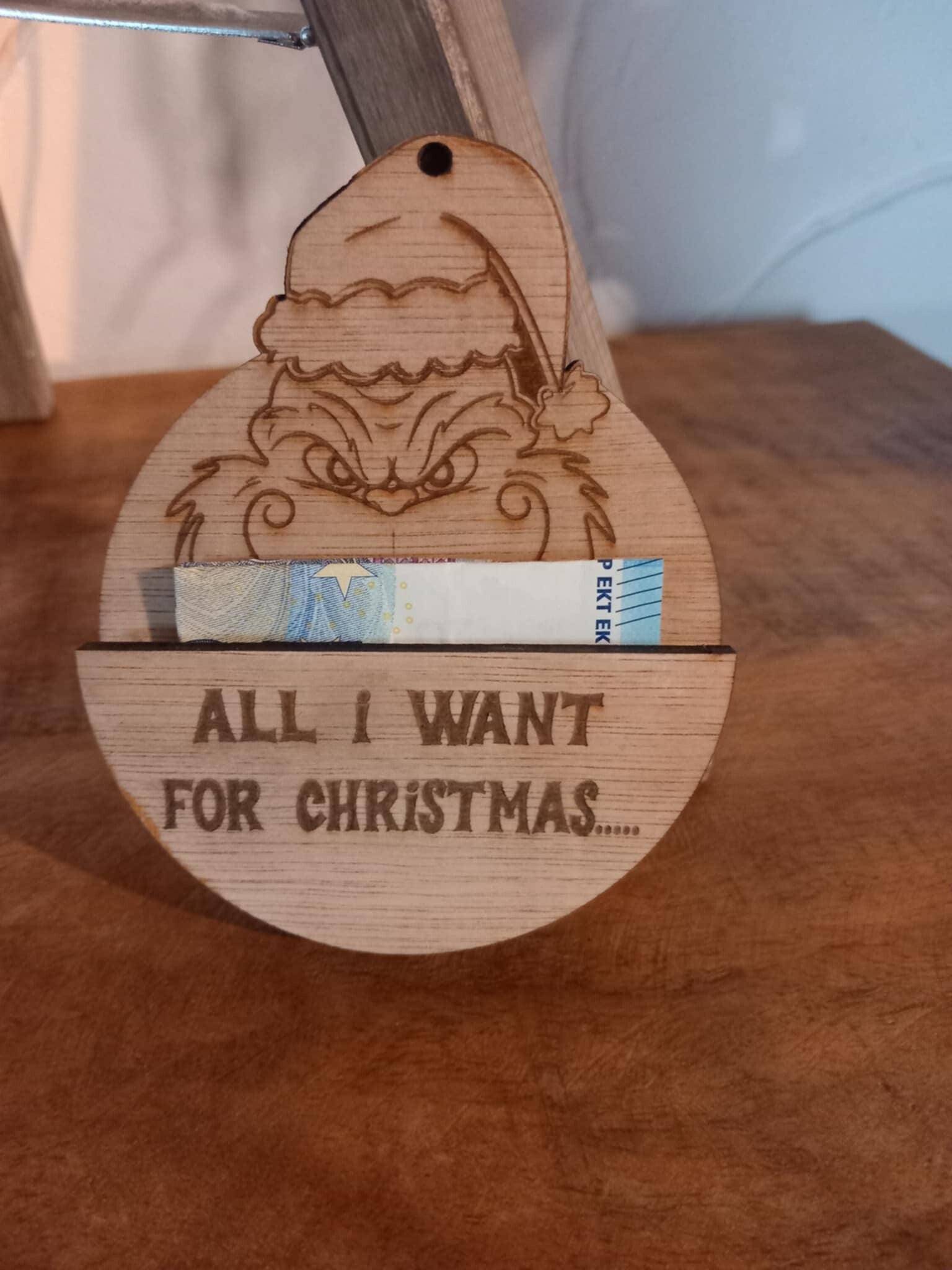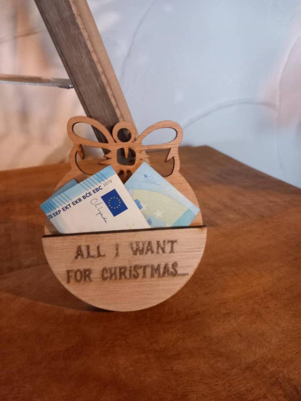 Houten geldbuideltje voorzien voor plaats voor het centje . voorzien van oogje om te kunnen ophangen in de kerstboom of rond servet met koordje ....