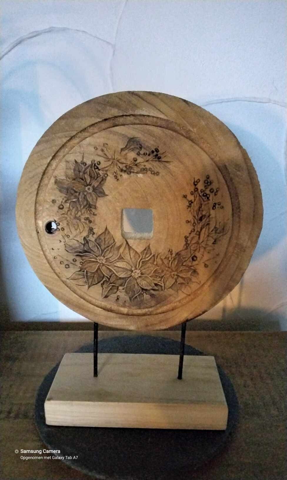 Houten bamboeschijf met een gelaserde bloemenillustratie.