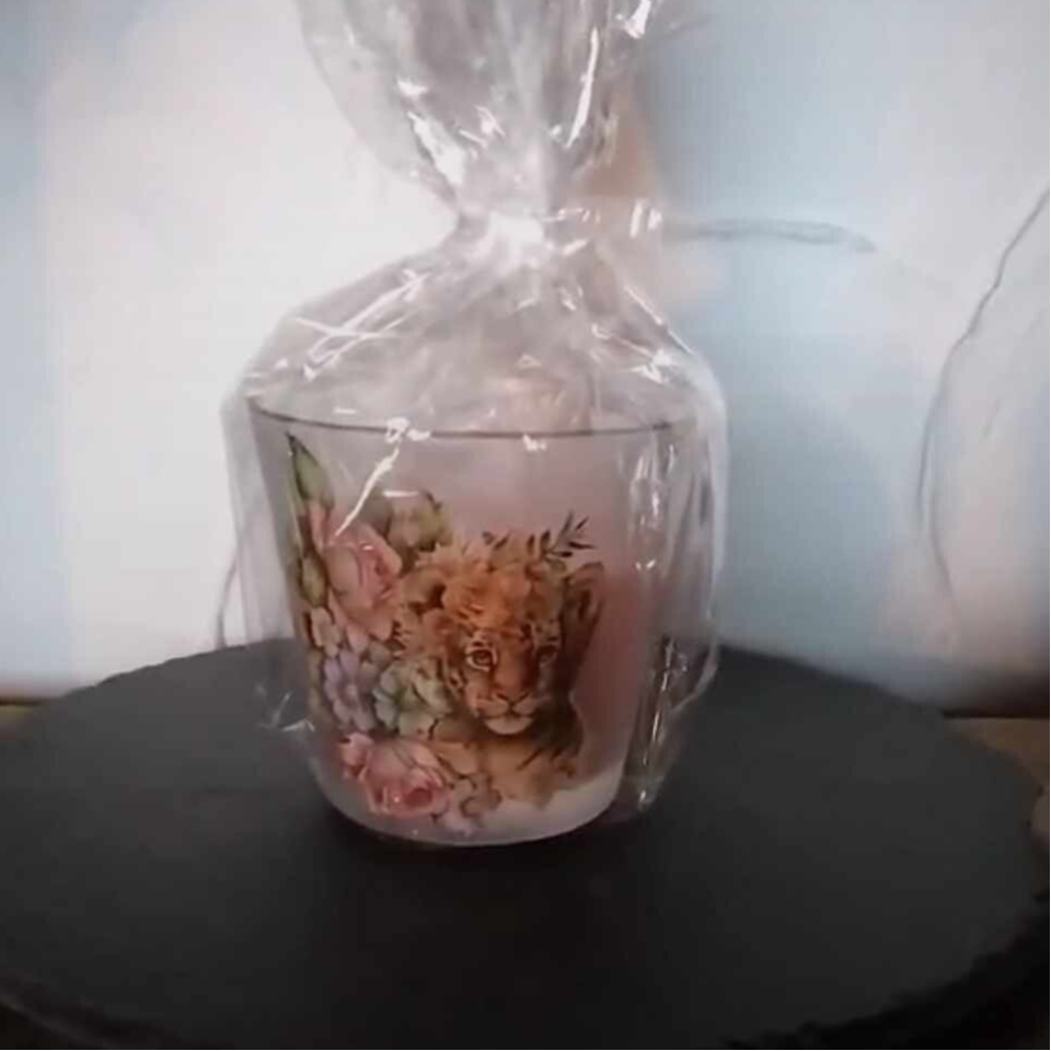 Roze geurkaars met 1 lont in glazen frostglas . Voorzien van tropische bloemen en een babytijgertje in mooie pastelkleuren en andere zijde de idem bloemen met klok.