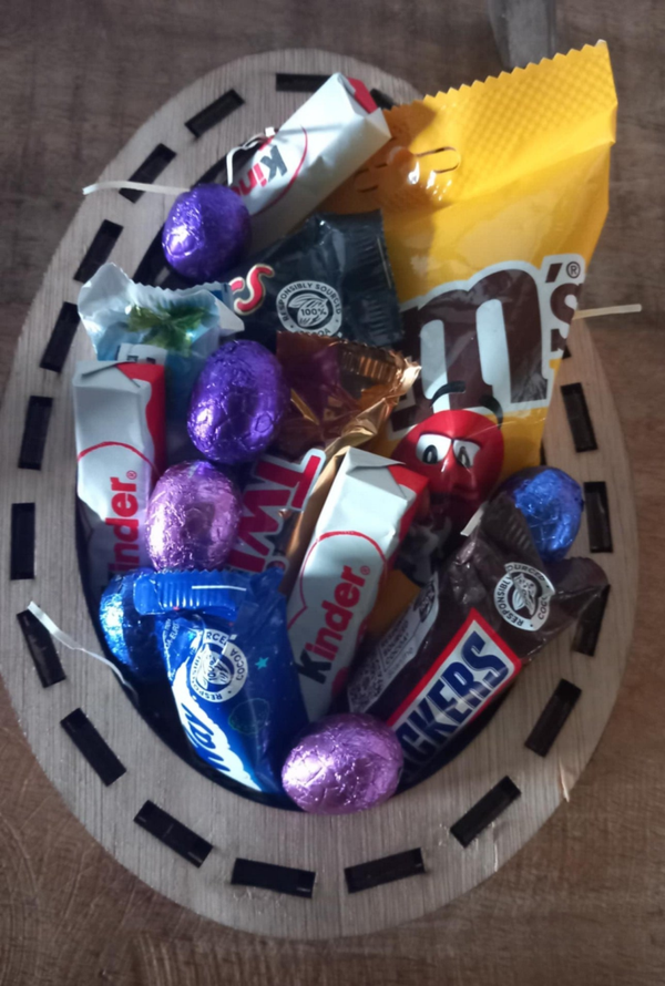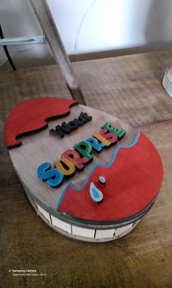 Een houten gelaserd Surprise Ei , handgeschilderd en vol met lekkers. En voorzien van een naam .