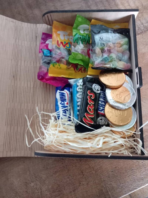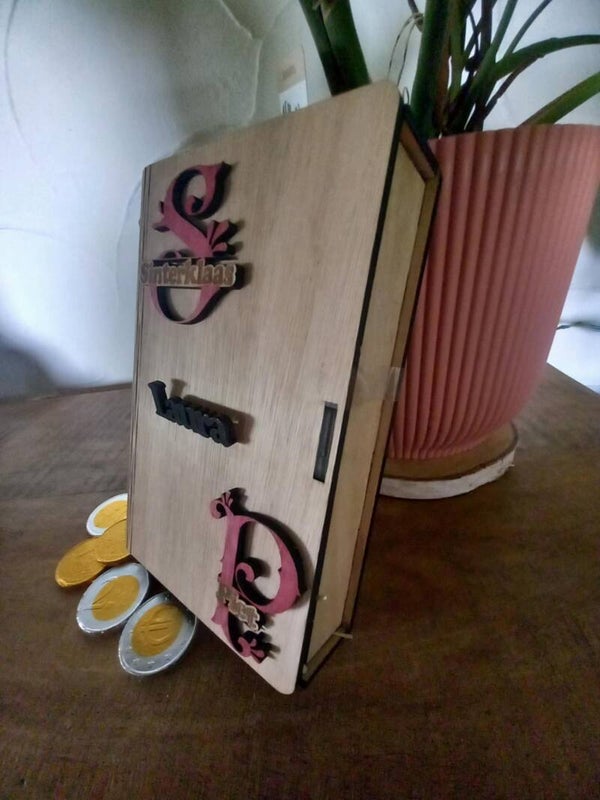 Houten gelaserd boek van Sinterklaas voorzien van de naam voor wie hij is . Gevuld met chocoladerepen muntjes en zakjes snoep.