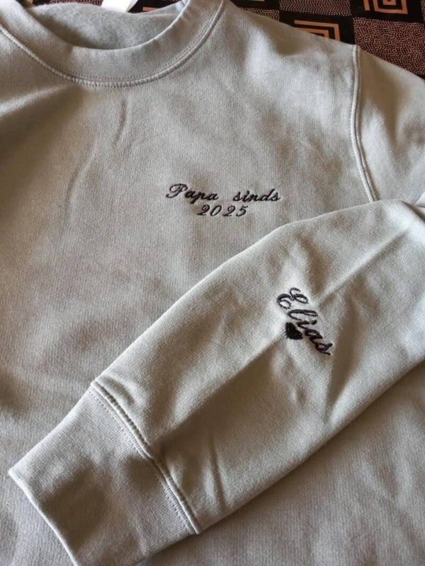 Geborduurde sweater voorzien van de namen van u kind(eren ) op de linkermouw. Kan zowel voor mama of papa geborduurd worden.5