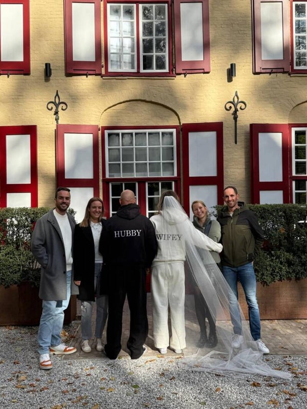 geborduurd en voorzien van huwelijksdatum op de mouw.